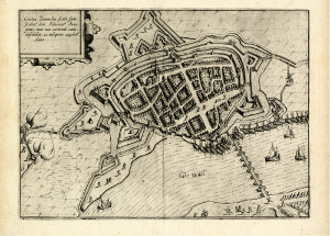 Mooi gekleurde en rijk met boten, dieren en wapens versierde plattegrond van Vlissingen